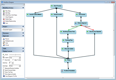Using a simple point and click approach, you can define work flow steps. The work flow steps can then be linked as serial work flow (dependencies), parallel work flow (multiple steps created at the same time with no dependencies) or adhoc (added by the service desk technician as required).