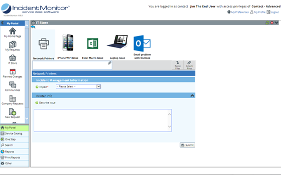 IncidentMonitor Service Catalog Designer gives you the ability to design web forms with their own unique process flow and published these to your user community. The Service Catalog allows you to group your services and present them in an easy to navigate collection to your users. Every group name or image can be defined by yourself. That way the services are easy to recognize by your users and your support team.
